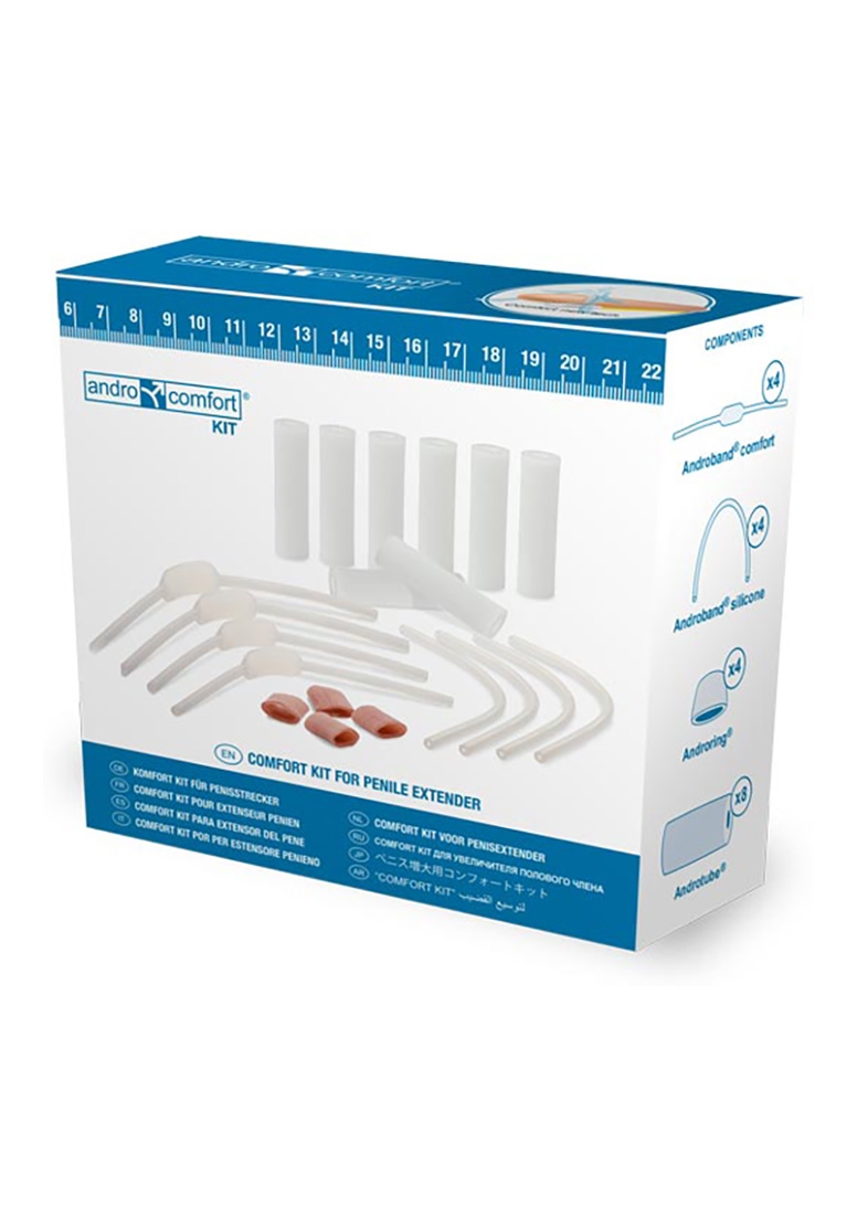 De Comfort kit bevat:- 4 Androcomfort Bands- 4 Androsilicone Bands- 8 Beschermende kussens (Androtop)- 4 Beschermende siliconen ringen (Androring).